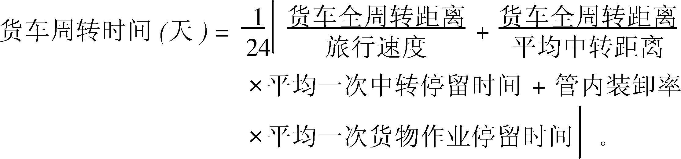 上式將貨車周轉(zhuǎn)時間分成區(qū)段的運行時間、編組站和區(qū)段站的中轉(zhuǎn)作業(yè)時間和裝車站和卸車站的貨物作業(yè)時間,其數(shù)值由許多相關(guān)指標(biāo)決定,反映了鐵路運營工作的各個方面,是供分析用的計算公式。貨車周轉(zhuǎn)時間的長短,取決于鐵路各個環(huán)節(jié)的工作質(zhì)量。提高旅行速度,壓縮空車走行率,延長有調(diào)中轉(zhuǎn)距離,壓縮有調(diào)中轉(zhuǎn)作業(yè)停留時間,以及一次貨物作業(yè)停留時間,是縮短貨車周轉(zhuǎn)時間的主要途徑。