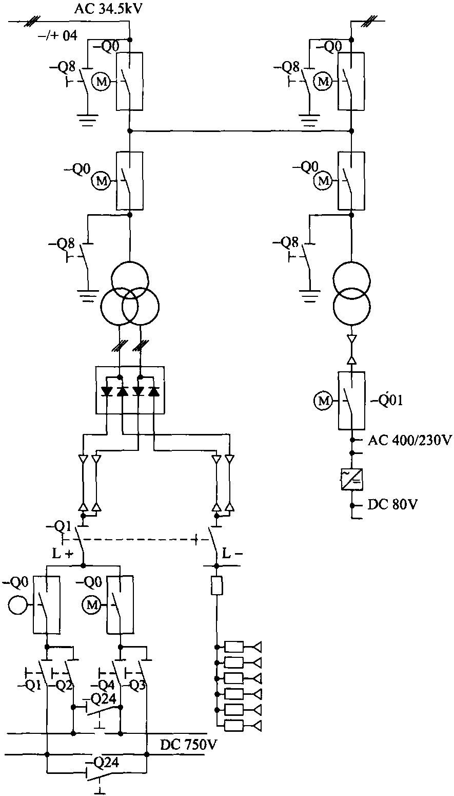 四座2.5MW的整流變電所,每座牽引變電所均以750V直流向正線第三軌供電。牽引變電所最大間距約為2.8km。在維護和修理期間牽引變電所可與750V直流第三軌和交流34kV中壓電網兩端完全隔離。
