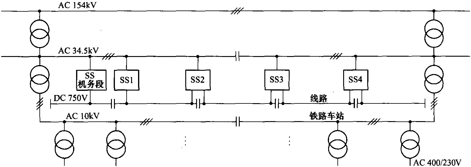 在地鐵線路兩端,由城市供電系統(tǒng)的兩座變電站從154kV電網向地鐵線路供電 (見圖1.21)?!∽冸娝械?54/34kV變壓器以34 kV中壓向整流牽引變電所供電。用兩臺34/10kV變壓器向構成環(huán)形的10kV供電回路供電,然后再通過供電回路向地鐵的各車站供電。