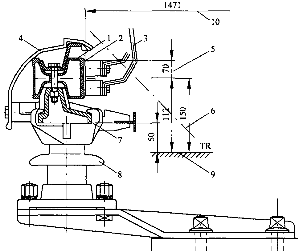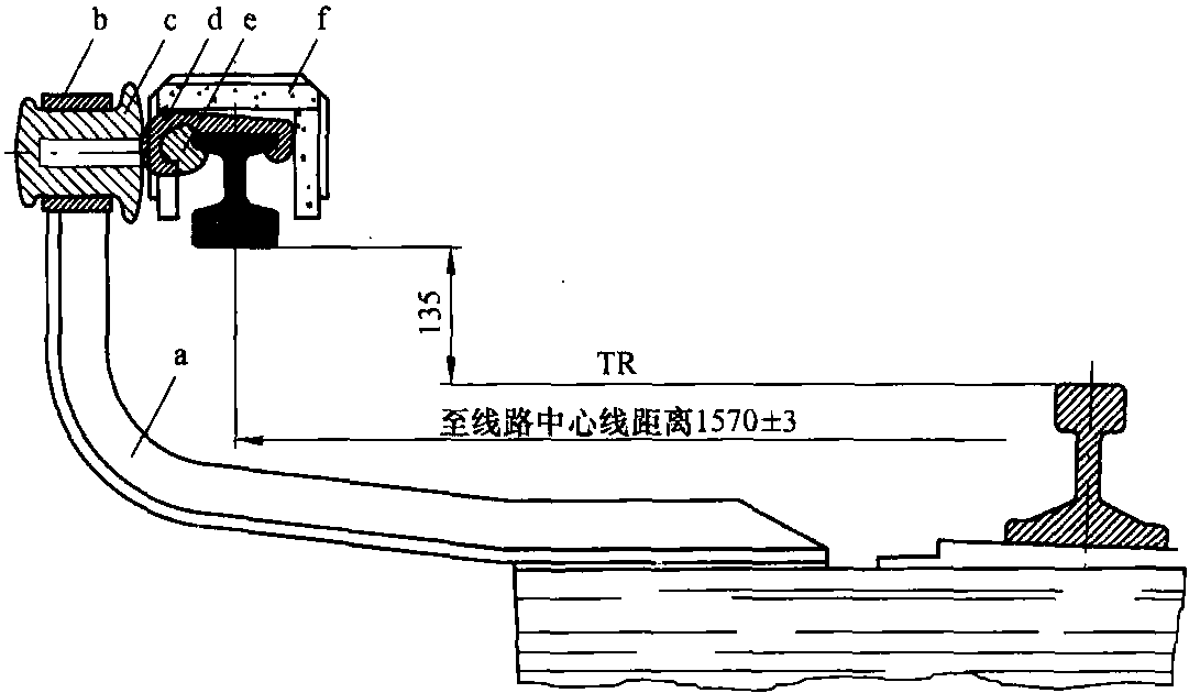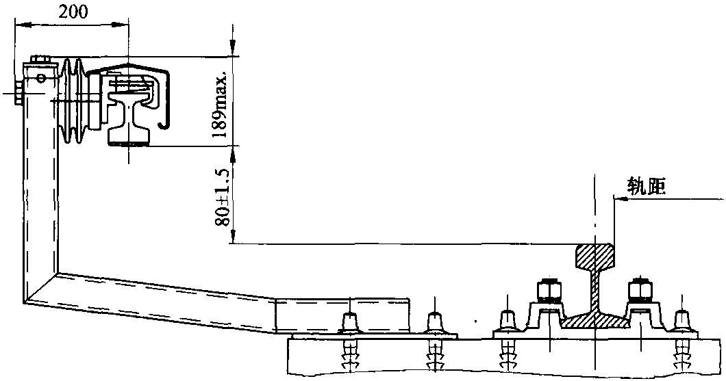 圖3.20為這種類型的鋼接觸軌的安裝樣式。在柏林都市鐵路系統(tǒng)中接觸軌支持裝置的間隔一般為5.2m。實際間隔要根據(jù)所應用的軌枕型號和軌道上部結構來定,間隔可擴大至6m。