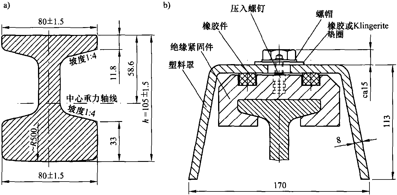 圖3.22為鋼鋁復合接觸軌系統(tǒng) [3.6],從圖中可見接觸軌支持裝置和用于鋼鋁復合第三軌的絕緣緊固件,這些緊固件可允許接觸軌縱向移動。這些接觸軌還罩有其機械、熱和電特性適應各種環(huán)境條件的塑料套件。