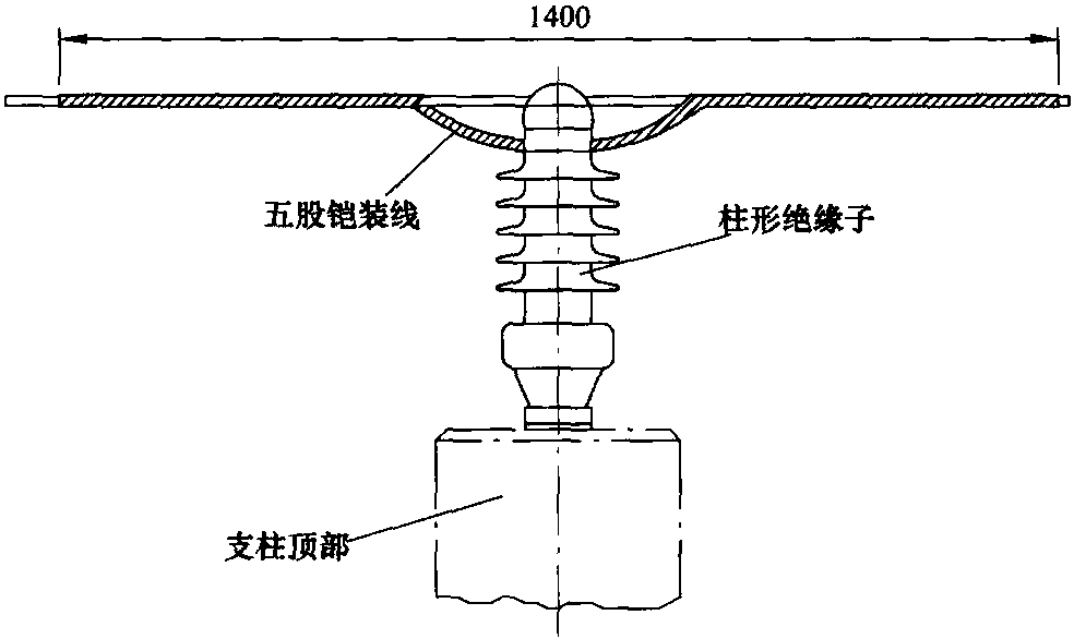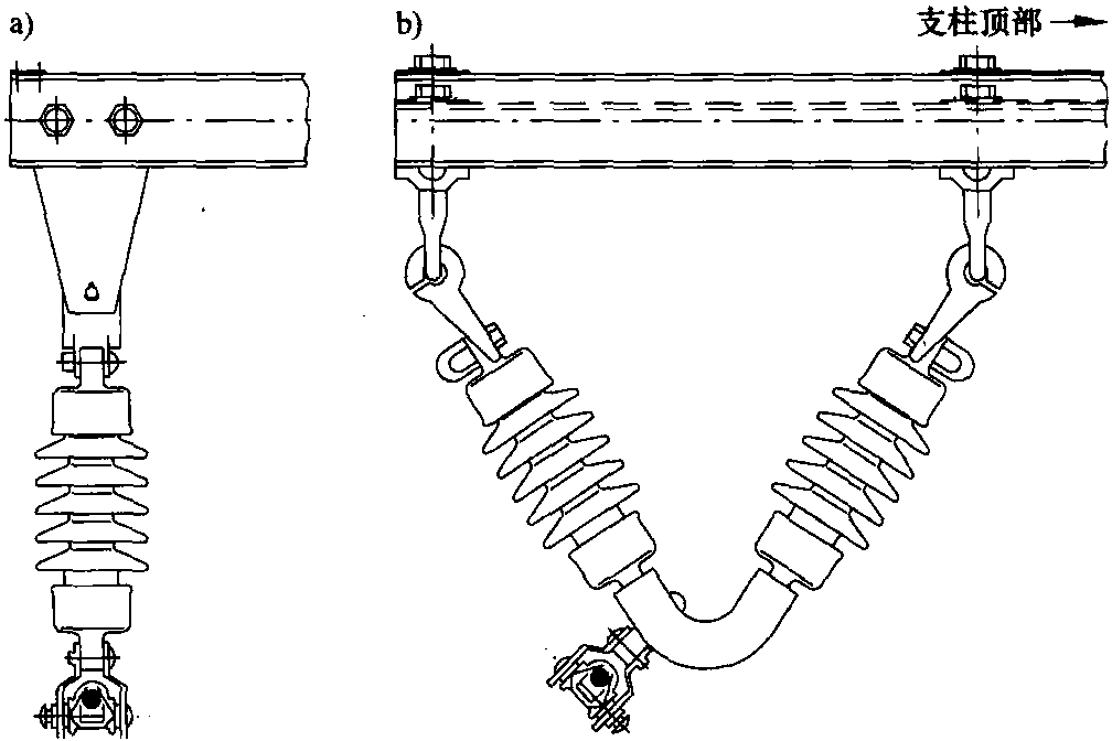 接觸網(wǎng)的支柱和吊柱也承載TPL線 (牽引供電線)。導(dǎo)線與柱形絕緣子(圖4.43) 或懸式絕緣子[圖4.44a) 和b)] 的固定連接在方式上存在差異。柱形絕緣子允許TPL線安裝在桿頂,不需要單獨的橫擔(dān); 但是這種布置只限于每桿一線。在曲線處,當(dāng)橫承力索交叉或必須遵守間隙時,懸式絕緣子就被用幾根并行的牽引供電線路。懸式絕緣結(jié)構(gòu)有單懸式布置 [圖4.44a)] 和雙懸式布置 [圖4.44b)],從安全考慮或線路有拐角情況時很有必要采用后者。