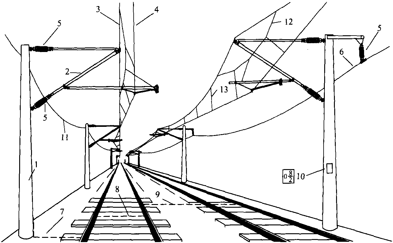 1—支柱; 2—腕臂; 3—承力索; 4—接觸線; 5—絕緣子; 6—供電線; 7—支柱至鋼軌接地線; 8—鋼軌電連接線; 9—上下行鋼軌電連接線; 10—支柱標(biāo)識牌; 11—回流線;12—彈性吊索; 13—吊弦