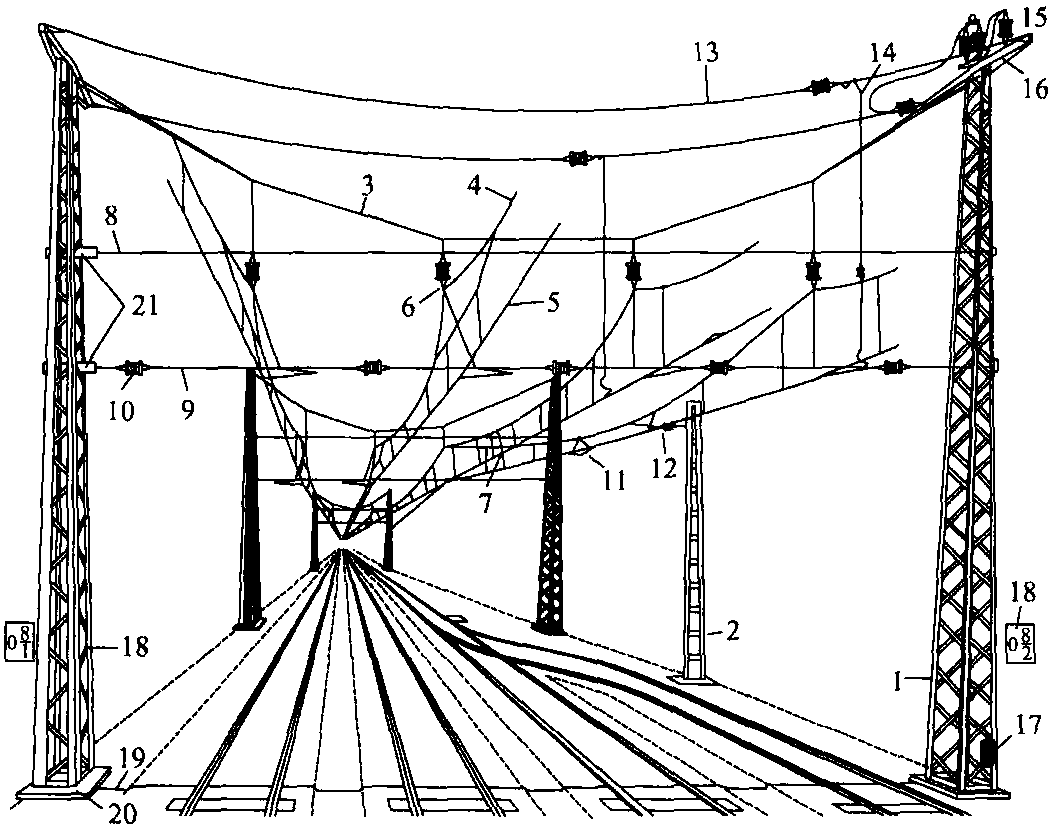 1—螺栓安裝桁架支柱; 2—螺栓安裝雙槽鋼支柱; 3—橫承力索; 4—承力索;5—接觸線; 6—軟橫跨懸掛點(diǎn); 7—載流連接 (電連接線); 8—上定位索;9—下定位索; 10—絕緣子; 11—分段絕緣器; 12—正定位; 13—開關(guān)用橫跨導(dǎo)線;14—開關(guān)用連接吊線; 15—隔離開關(guān); 16—開關(guān)托架; 17—電動開關(guān)操縱機(jī)構(gòu);18—支柱標(biāo)識牌; 19—支柱接地; 20—支柱基礎(chǔ); 21—定位索張力補(bǔ)償彈簧