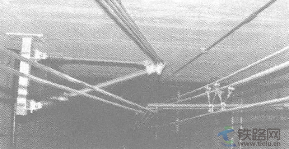 四根Cu 150型加強(qiáng)線除向接觸線外還向隧道內(nèi)提供電流。后來修建的Twuen-Wan線路采用旋轉(zhuǎn)管形腕臂支撐著接觸網(wǎng) (如圖4.86所示)。接觸懸掛由兩根CuAg AC-120型接觸線和兩根Cu 150型承力索組成。單獨(dú)的定位器使兩根接觸線的拉出值均為±0.20,接觸線的張力為24kN,承力索上的張力為24kN。此外,隧道頂上柱形絕緣子上兩根Cu 150型加強(qiáng)線向速度為90km/h的電動(dòng)車組供電。在車站,一根承力索懸掛著兩根接觸線。一條附加的加強(qiáng)線對(duì)這一區(qū)域及接觸網(wǎng)提供電流。圖4.87是接觸網(wǎng)錨段關(guān)節(jié),每一個(gè)錨段關(guān)節(jié)由兩根承力索和兩根接觸線組成。