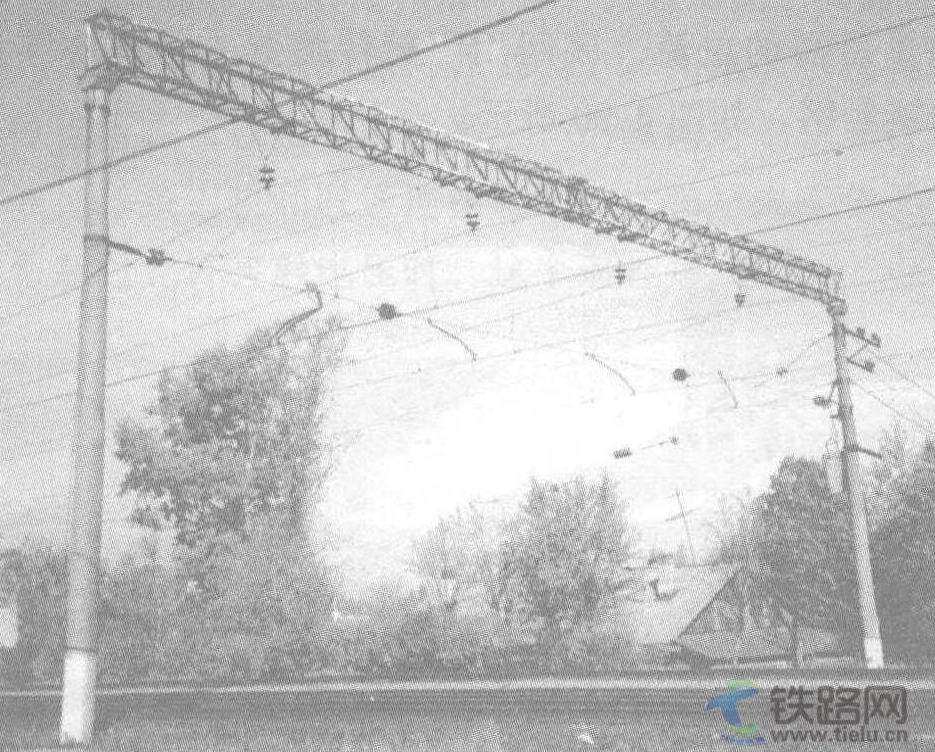 補償器用來補償因溫度引起的承力索和接觸線的長度變化。所采用的絕緣子同樣適用于交流25kV運行。站區(qū)內(nèi),十月鐵路公司除軟橫跨裝置外,還使用硬橫跨結(jié)構(gòu)。如圖4.92所示,混凝土支柱支撐著桁架硬橫梁,下定位索將接觸線支持裝置固定在硬橫跨上。