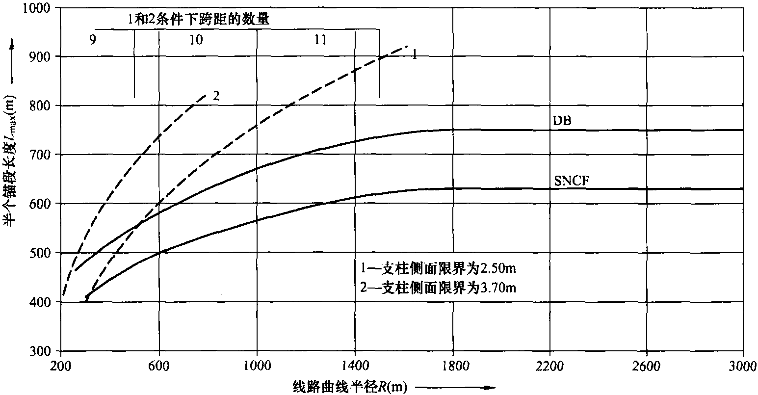 通過 [6.6],對于支柱側(cè)面限界為2.5m并充分利用同一架空接觸網(wǎng)系統(tǒng)的最大允許張力增量,可以得到半個錨段長度和縱向跨距間的最佳關(guān)系。數(shù)字公式采用