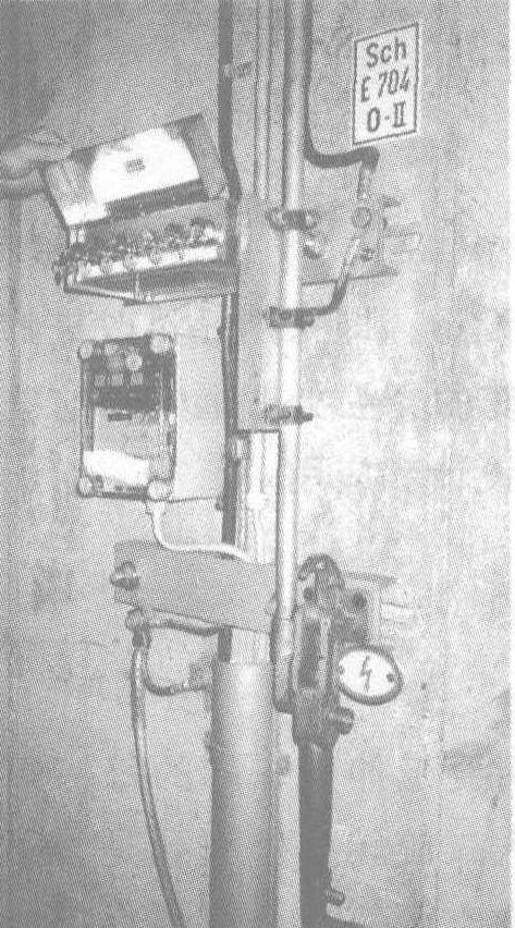 車庫(kù)股道隔離開關(guān)用來(lái)將該股道的接觸網(wǎng)及維修設(shè)備斷電并接地。它們都設(shè)有接地點(diǎn)。隔離開關(guān)在斷開狀態(tài)下被鎖定。用來(lái)打開工作平臺(tái)入口的鑰匙只有在隔離開關(guān)處于斷開并接地的條件下才能拔出。在裝配工作占用的股道數(shù)超過兩股道時(shí),則可用一個(gè)車庫(kù)外部的總開關(guān)來(lái)分?jǐn)嗨泄傻赖慕佑|網(wǎng)。圖8.2所示為德國(guó)鐵路慕尼黑的一個(gè)典型車庫(kù)的總開關(guān)裝置。