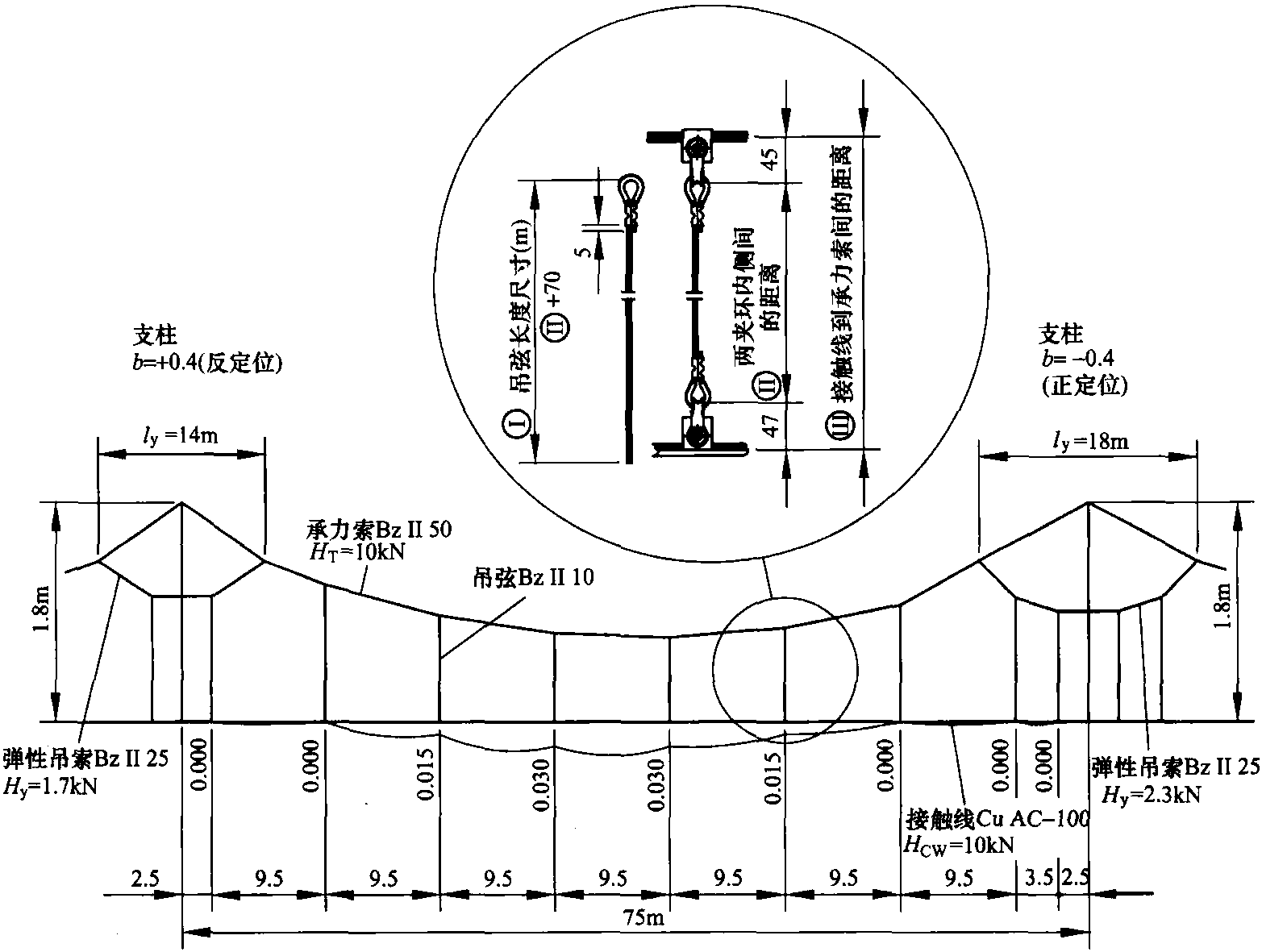 網(wǎng)系統(tǒng)的彈性吊索吊弦的設置。75m長的跨距其吊弦的間距為9.5m(見圖6.60)。
