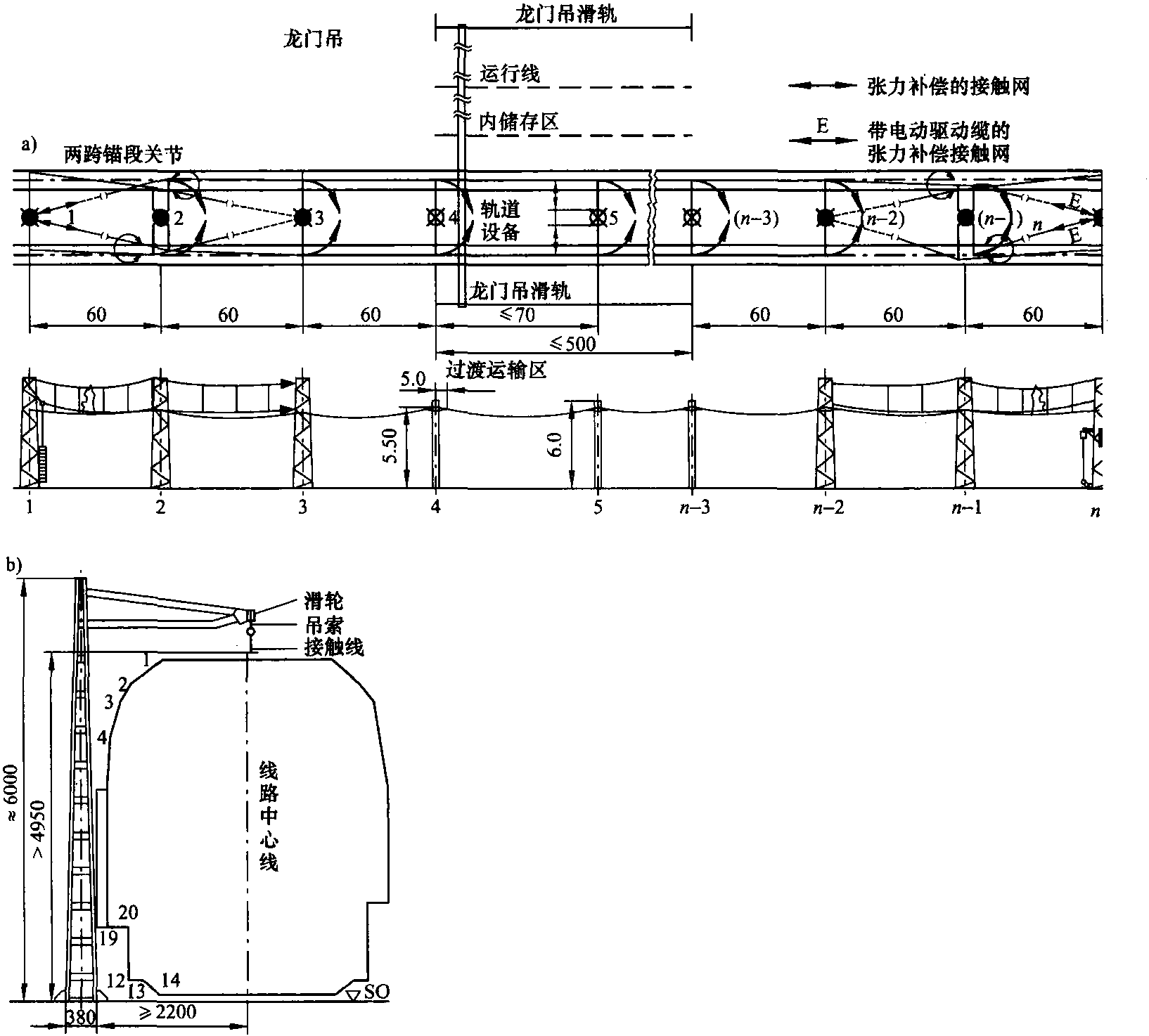 圖8.30 集裝箱終點(diǎn)站的水平旋轉(zhuǎn)接觸網(wǎng)