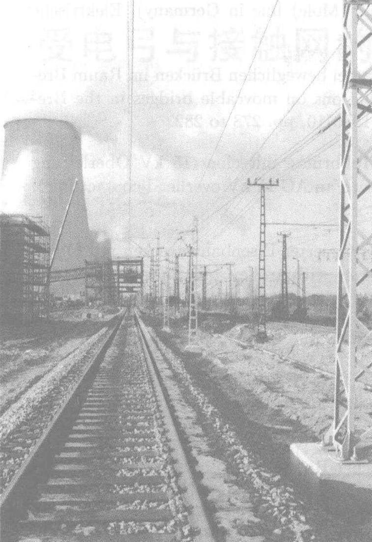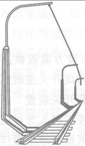 在礦區(qū)內(nèi),架設(shè)簡單接觸網(wǎng)電車線的支柱直接固定在可移動的鋼軌上,通常稱之為采場型接觸網(wǎng)(圖8.32)。鋼軌末端安裝著線架,被稱為末端固定架,以彌補(bǔ)礦區(qū)鐵路運(yùn)行時(shí)對長度變化的要求。移動鋼軌前先通過斷路器將接觸網(wǎng)斷電,然后再將其接地。礦區(qū)電力機(jī)車側(cè)面裝有附加的受流器(圖8.33)。它們向股道區(qū)間內(nèi)配置的用于編組操作的獨(dú)立移動裝置供電,而側(cè)面安裝的電車線為機(jī)車的裝卸作業(yè)提供了必要的空間 (圖8.34)。