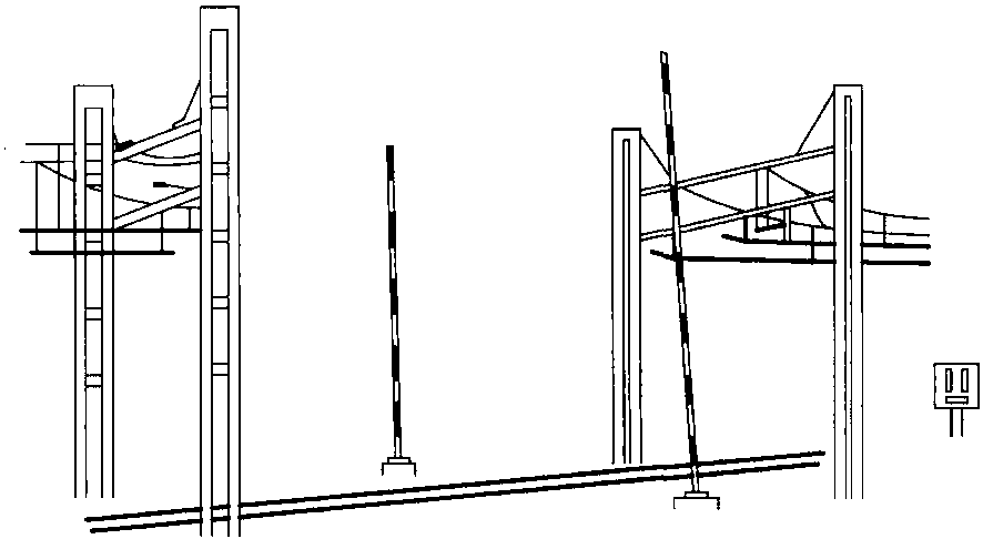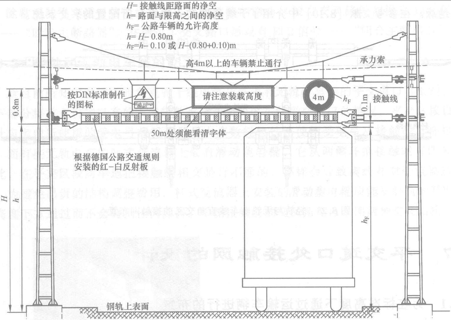 如果平交道口處接觸線下降并低于上述最小高度,則必須在平交道口處設(shè)置限制公路車輛高度用的高度限制結(jié)構(gòu)來保護(hù)平交道口處的裝置。同時要配有警示標(biāo)志,上面有 “小心,高壓危險” 的標(biāo)識,還要按照德國公路交通規(guī)則設(shè)置相應(yīng)的 (StVO) 交通禁止標(biāo)志。圖8.24所示為限制高度的限界門,限界門的下沿距接觸線0.8m。交通標(biāo)志牌上顯示的最高限度一定要小于實際限制高度0.1m。這樣的措施在鐵路穿過低矮橋梁時是必要的。例如,平交道口處的步行橋就會降低接觸網(wǎng)的凈空高度。