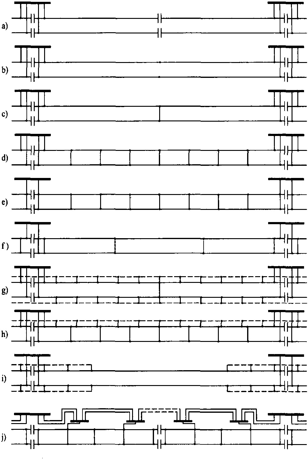 饋電加強(qiáng)線經(jīng)過特定的間距電氣上長(zhǎng)期地連接到接觸網(wǎng)上,可能平行地安裝到雙線鐵路線的二個(gè)或僅僅一個(gè)接觸網(wǎng)上。在實(shí)踐中也采用如圖10.13i) 中所示的僅在變電所附近地點(diǎn)裝設(shè)加強(qiáng)線的方案。