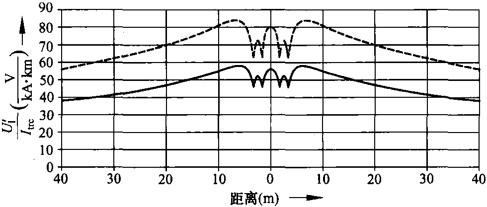 圖12.33 與鐵路線并行安裝的回流線上,單位長(zhǎng)度的感應(yīng)縱向電壓 (感應(yīng)縱電動(dòng)勢(shì)) 和牽引電流的比,σE=100Ωm