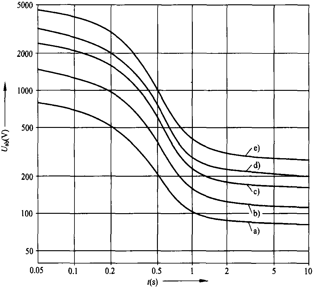 圖12.4 根據(jù)HD 637 S1,假定在接觸回路中包含附加電阻,電流作用時(shí)間與最大允許接觸電壓的關(guān)系