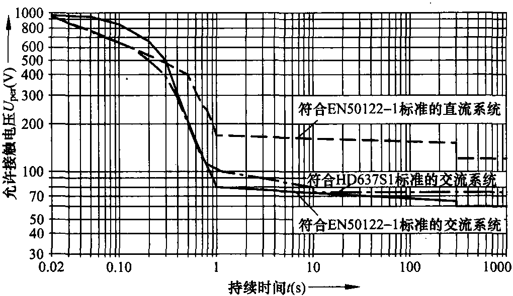 圖12.2 根據(jù)EN 50122-1和HD 637 S1標(biāo)準(zhǔn),允許接觸電壓Uper與電流持續(xù)時(shí)間t的關(guān)系曲線。