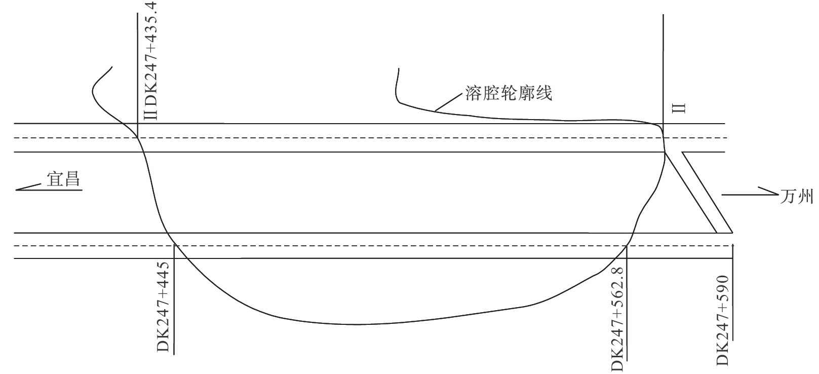 溶腔平面形態(tài):溶腔沿巖層走向(順層間)發(fā)育,線路與其近垂直。溶腔橫向?qū)?沿Ⅰ線縱向長(zhǎng)DK247+445~+562.8,計(jì)長(zhǎng)117m、沿Ⅱ線縱向長(zhǎng)DK247+435.4~+572. 8,計(jì)137m)117~137m,溶腔走向長(zhǎng)因未完全揭露難以確定(隧道洞內(nèi)可觀測(cè)長(zhǎng)度大于60m)(圖2-42)。