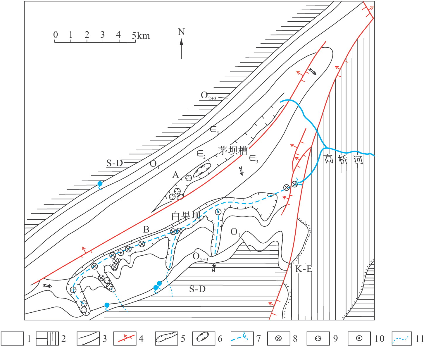 1.碳酸鹽巖分布區(qū);2.碎屑巖分布區(qū);3.地層界線;4.巖溶槽谷;5.角度不整合;6.巖溶洼地;