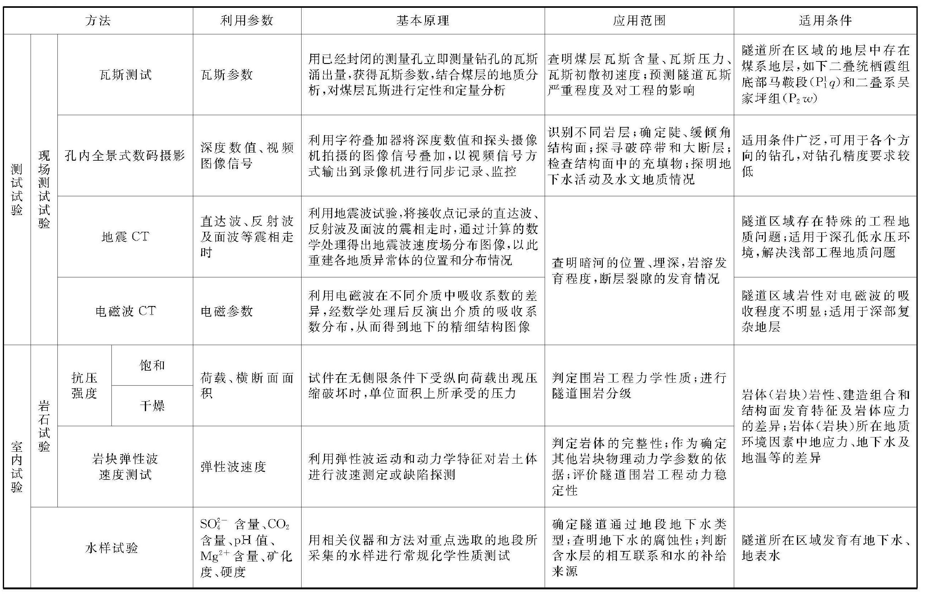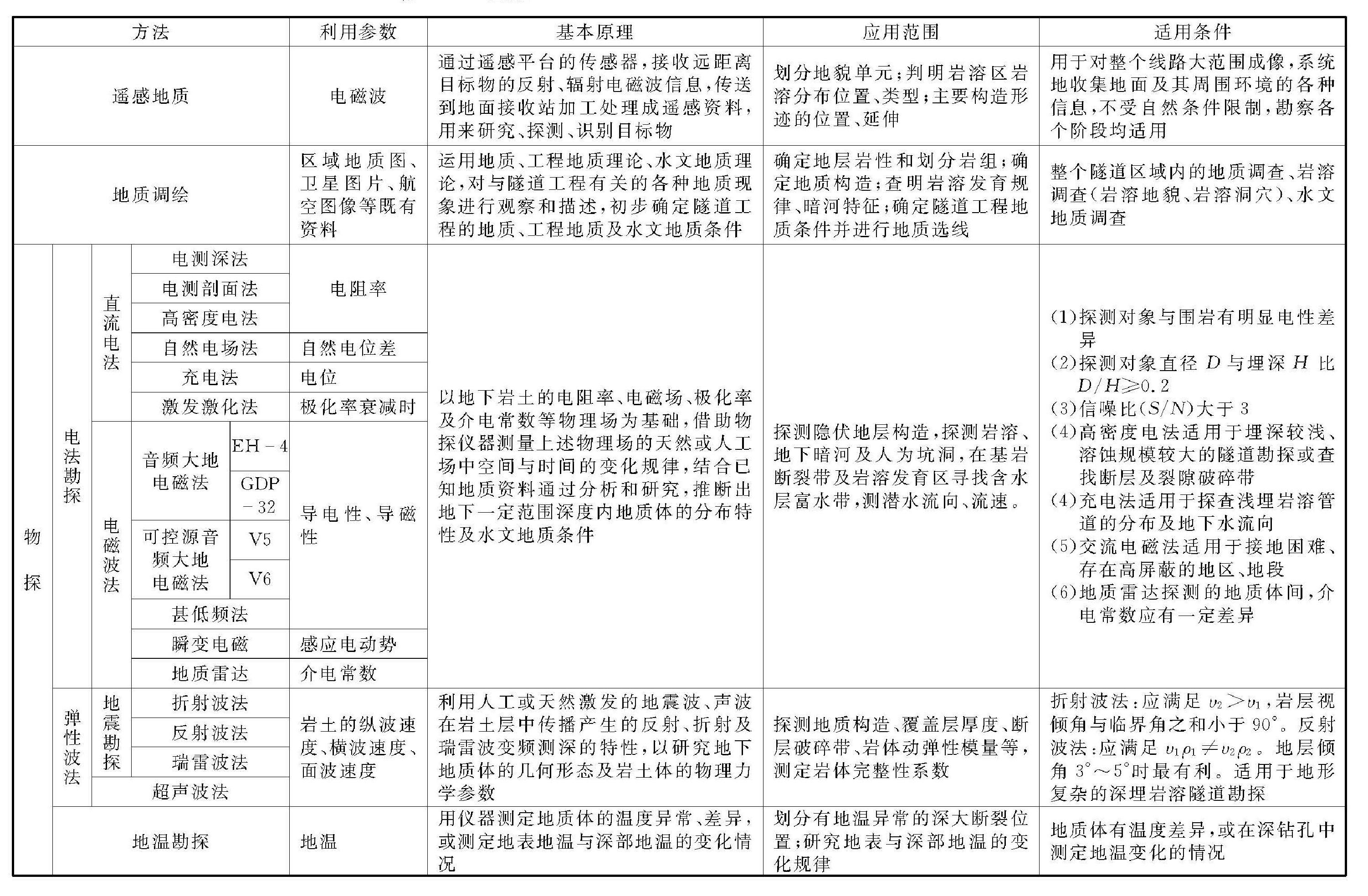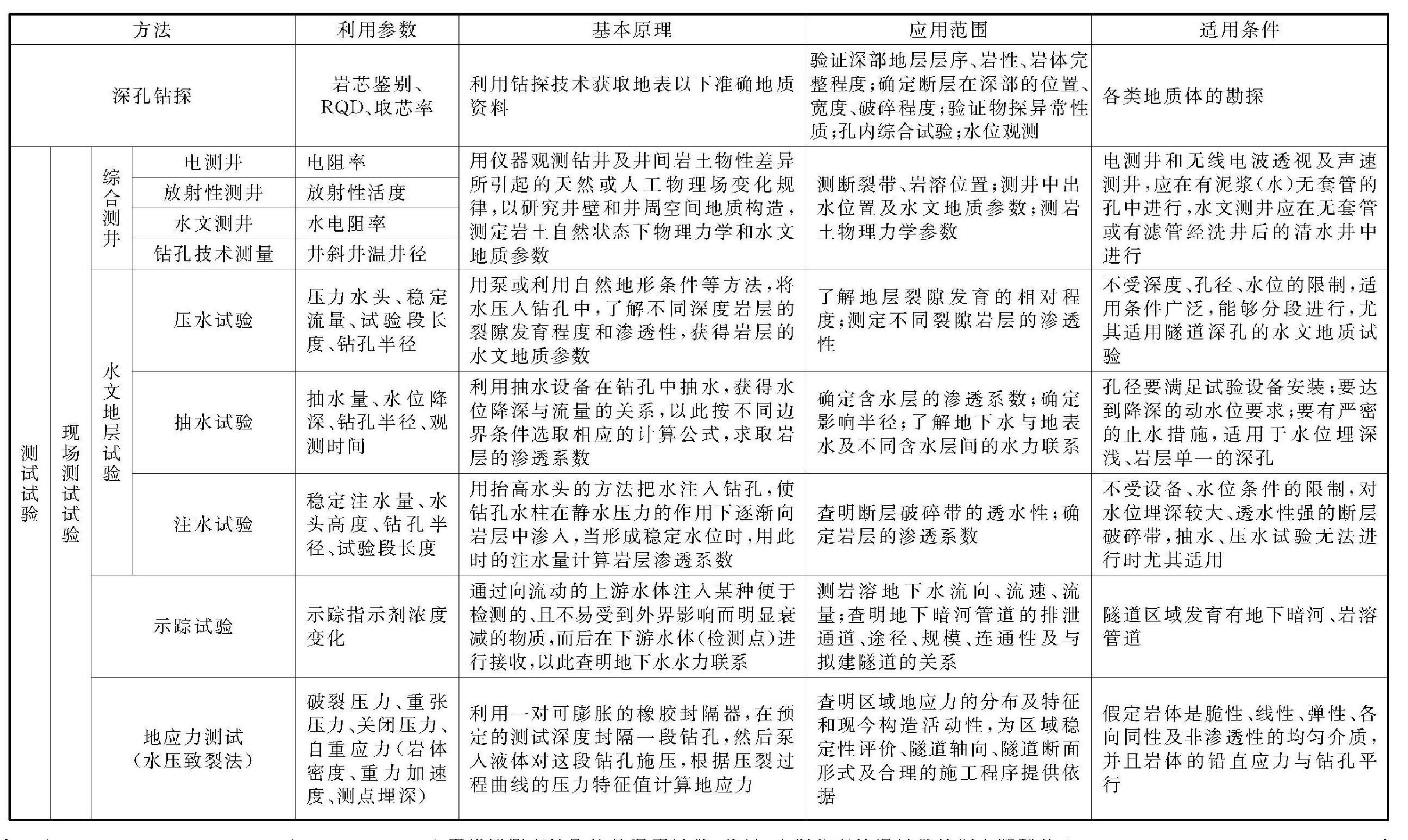 深埋復(fù)雜巖溶隧道必須開展多階段、多方法的綜合工程地質(zhì)勘察工作,并結(jié)合各種勘察方法的應(yīng)用條件和特點進(jìn)行合理組合,最終查明隧道區(qū)的工程地質(zhì)及巖溶水文地質(zhì)條件,各勘察方法的適用條件及使用范圍總結(jié)如下(表3-28):