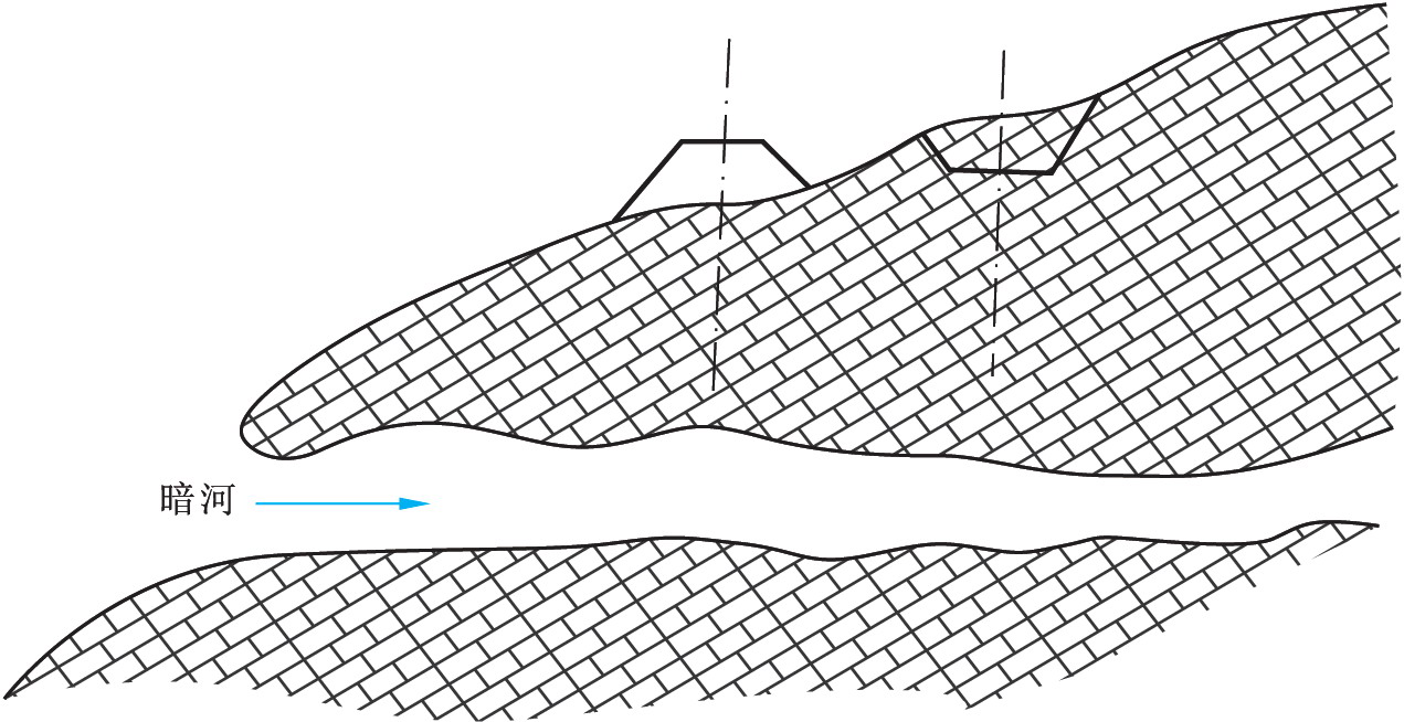 (1)線路標高低于暗河時,有三種可選方案,如圖4-3所示。Ⅰ方案線路在暗河下游,可將頂板揭開,設橋涵通過;Ⅱ方案以長路塹通過,挖方工程大,路基排水需特殊處理;Ⅲ方案以隧道通過,水文地質(zhì)條件不佳,頂板也要求有足夠厚度。實際工作時,可根據(jù)具體條件進行選擇。