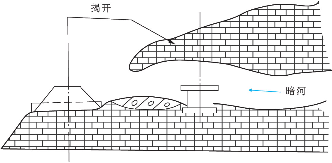 (2)線路標高接近于暗河標高時,應將線路選定在暗河出口下游穩(wěn)定地層通過。當受條件限制時,最好揭開暗河,以橋或涵代替路基通過(圖4-4)。