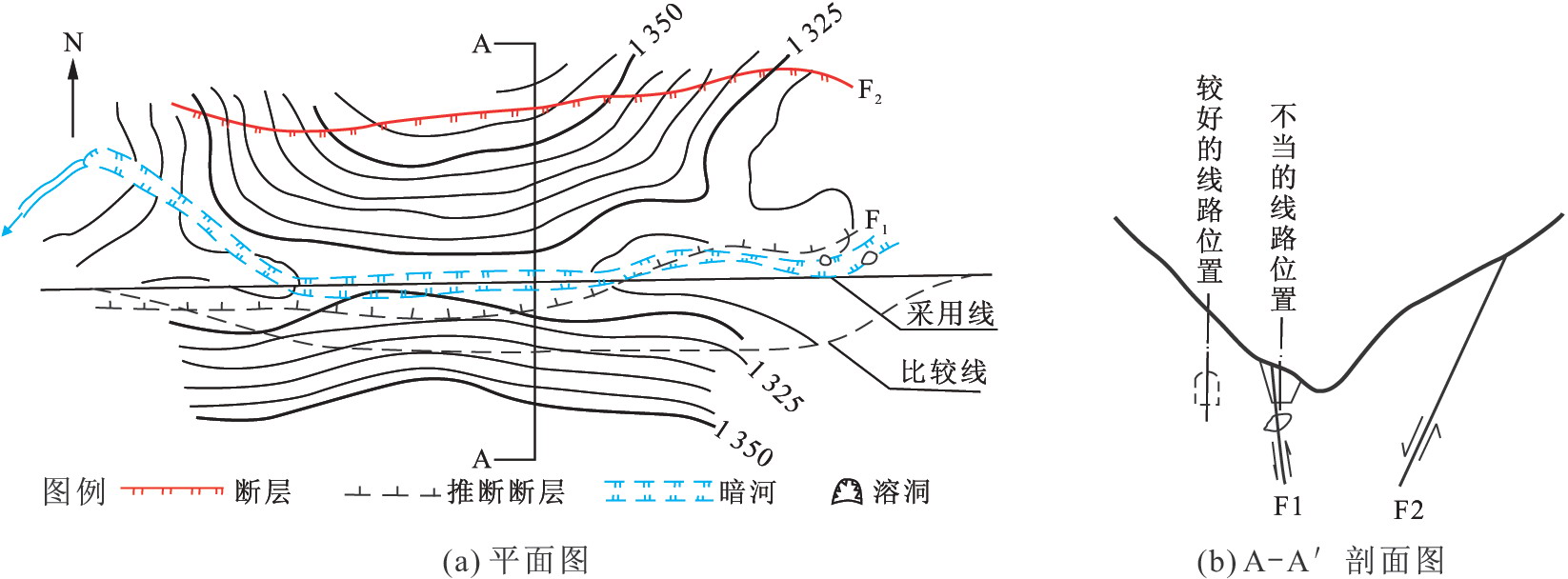 (3)巖溶地區(qū)的地質(zhì)構造線一般有明顯的地貌特征。埡口、干谷、溶蝕洼地、坡立谷等經(jīng)常發(fā)育于構造帶上,對這些地貌上的薄弱點,須查明是否有構造破碎帶和巖溶的存在,從而正確選擇線路位置。如圖4-2所示的兩條平行斷層之間的埡口,其下有沿斷層發(fā)育的暗河,某線大致沿斷層方向以路塹通過這一地段,致使大段路塹落在暗河頂上,給鐵路建設帶來許多困難。如將線路外移至斷層外側(cè),既不受暗河的影響,線路條件也較好。