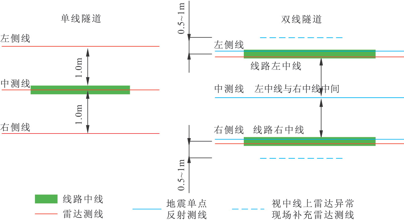 (2)雙線隧道三條地震單點反射測線布置在左中線、右中線及左右中線中間,地質(zhì)雷達測線左、右中線各布置一條。如遇重大異常,在左右中線外側(cè)0.5~1m處再補充地質(zhì)單點反射測線,補充范圍視異常范圍而定。