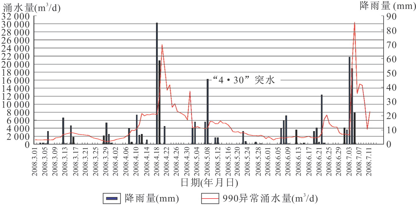對(duì)降雨量、出水點(diǎn)水量、水壓進(jìn)行動(dòng)態(tài)監(jiān)測(cè),得出:地下水受大氣降水補(bǔ)給,降雨后8~12h地下水開始明顯增大,停雨后24~48h地下水恢復(fù)正常;峰值涌水量2.3萬(wàn)m3/h,孔水壓在0.3~0.8MPa之間變化。大支坪隧道990異常涌水量、降雨量—時(shí)間關(guān)系曲線如圖6-44所示。