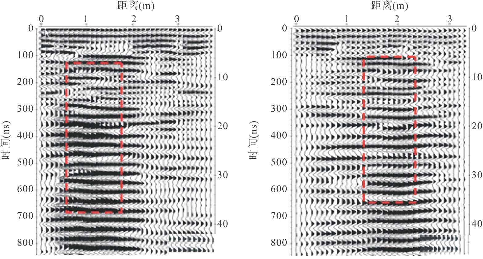 在DK132+923掌子面,采用地質(zhì)雷達(dá)探測(cè)DK132+923~+938段地質(zhì)情況。DK132+923~+938段15m范圍內(nèi),圍巖較破碎;DK132+938~+953段15m范圍內(nèi),巖溶裂隙發(fā)育,如圖6-42所示。