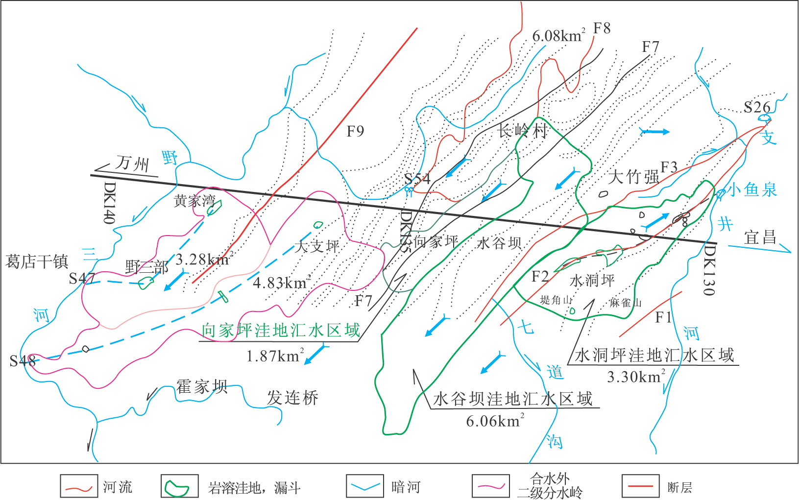 (1)隧道集水面積A。該段的集水面積應(yīng)為水谷壩洼地的匯水面積,為6.06km2;
