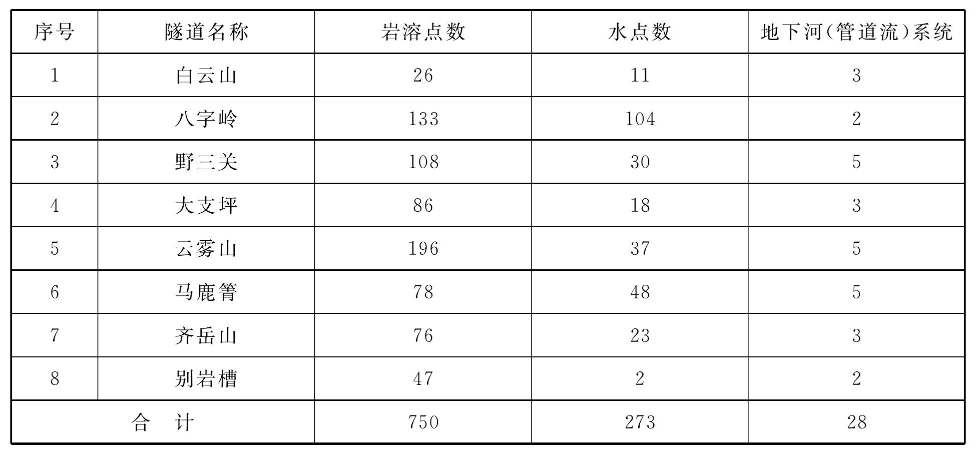 表8-3隧道巖溶點、水點、地下河統(tǒng)計表