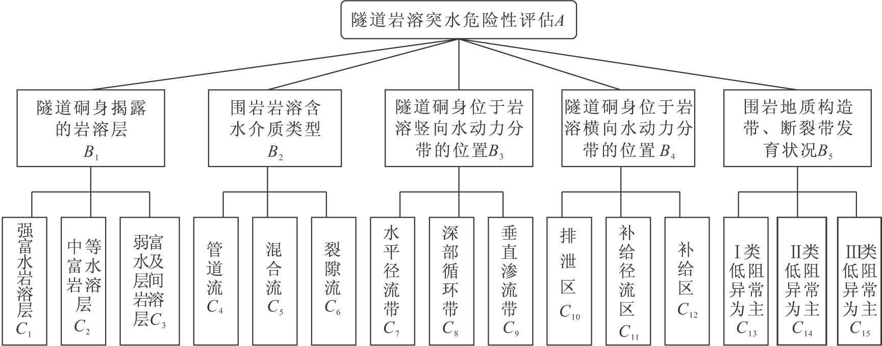 目前,各種地質(zhì)災(zāi)害危險性評估主要采用工程地質(zhì)比擬法、成因歷史分析法、層次分析法、數(shù)字統(tǒng)計法等定性、半定量方法。工程地質(zhì)比擬法、成因歷史分析法、數(shù)字統(tǒng)計法相關(guān)資料較多,下面重點介紹層次分析法評估宜萬鐵路隧道巖溶突水災(zāi)害危險性。