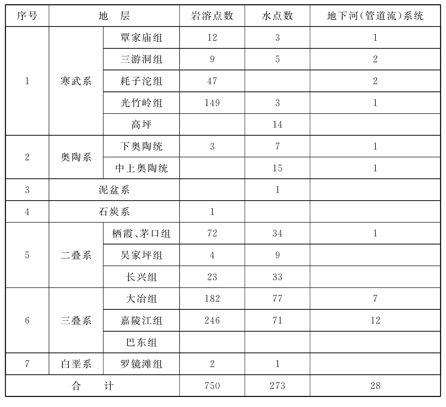 2)溶洞裂隙中等發(fā)育的寒武系中統(tǒng)及上統(tǒng)(∈2+3)、下奧陶系(O1)、二疊系棲霞組(P1q)、茅口組(P1m)和長興組(P2c)碳酸鹽巖含水組;九組地層巖溶點為319個,占43%;水點數(shù)123個,占45%;地下河和管道流9處,占32%。