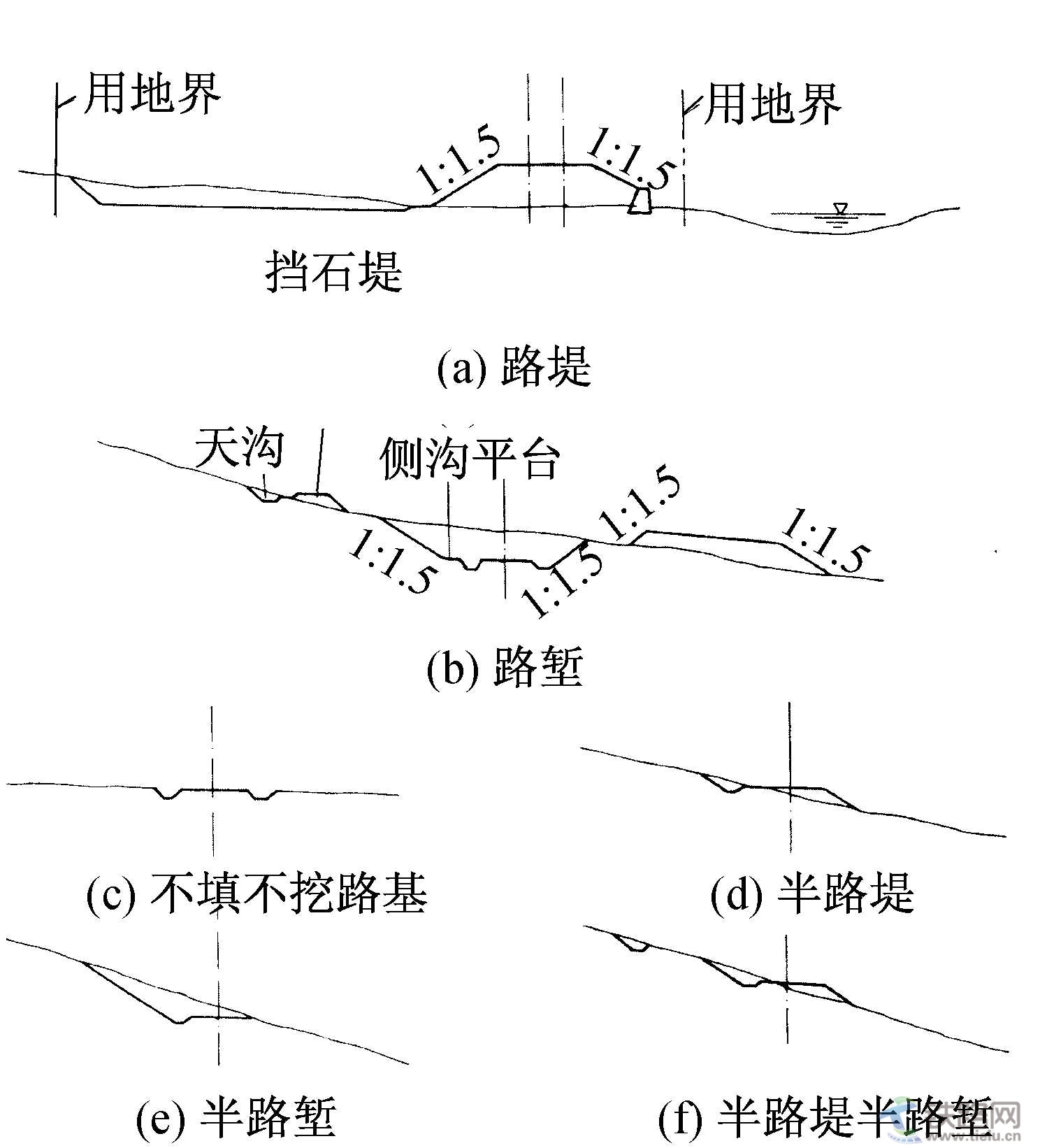 鐵路軌道的基礎(chǔ)!鐵路線路的重要組成部分。與橋梁、隧道相連,共同組成一個(gè)線路整體。由路基本體、路基防護(hù)和加固建筑物以及路基排水設(shè)備三部分組成,路基本體是直接鋪設(shè)軌道結(jié)構(gòu)并承受列車荷載的主體建筑物,其余均屬附屬建筑物。按線路設(shè)計(jì)的路肩標(biāo)高與地面標(biāo)高的關(guān)系,有的要填筑成路堤(圖a),有的則要開挖成路塹(圖b),此外,還有半路堤(圖d),半路塹(圖e),半堤半塹(圖f)和不填不挖(圖c)等形式。其中路堤和路塹是最主要的兩種形式。