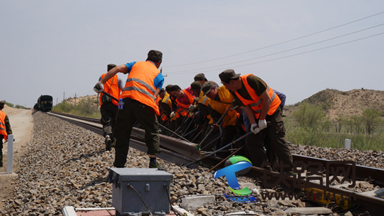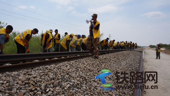 此次卸軌為路橋二隊(duì)8月份的首次途卸,上午8:00隊(duì)安全總監(jiān)組織安全員及防護(hù)員對(duì)卸軌區(qū)段進(jìn)行安全檢查。對(duì)可能碰壞的信號(hào)、通信等行車(chē)設(shè)備安設(shè)好相關(guān)標(biāo)示牌,且設(shè)備管理單位已派監(jiān)管至現(xiàn)場(chǎng)進(jìn)行安全監(jiān)護(hù)。同時(shí)要求車(chē)站駐站聯(lián)絡(luò)員、現(xiàn)場(chǎng)防護(hù)員及負(fù)責(zé)人現(xiàn)場(chǎng)加強(qiáng)與長(zhǎng)軌列車(chē)作業(yè)人員的聯(lián)控。10:40蘇木特車(chē)站準(zhǔn)時(shí)給出封鎖時(shí)間點(diǎn),卸軌區(qū)間兩端迅速安設(shè)固定封鎖標(biāo)示牌并安排專(zhuān)職防護(hù)員進(jìn)行防護(hù)。10:50隨著運(yùn)軌列車(chē)進(jìn)入途卸區(qū)間,列車(chē)按調(diào)度命令位置停下后,現(xiàn)場(chǎng)施工負(fù)責(zé)人通過(guò)對(duì)講機(jī)指揮列車(chē)對(duì)準(zhǔn)卸軌位置,列車(chē)保持5km/h速度開(kāi)始移動(dòng),在一片歡呼聲下成功的將長(zhǎng)軌卸到既有線(xiàn)兩側(cè),隨著現(xiàn)場(chǎng)負(fù)責(zé)人高亢的號(hào)子聲,碩長(zhǎng)的撥軌現(xiàn)場(chǎng),所有作業(yè)人員都揮汗如雨,精神振奮,有條不絮在施工負(fù)責(zé)人的指揮下有節(jié)奏的吆喝著將鋼軌撥于路肩下。隨后便開(kāi)始對(duì)既有線(xiàn)路道床進(jìn)行恢復(fù),并按規(guī)范要求恢復(fù)至標(biāo)準(zhǔn)道床。截止下午13:30路橋二隊(duì)成功完成了3公里7對(duì)長(zhǎng)軌的途卸。