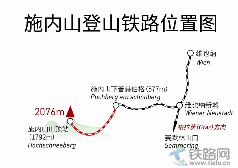 1897年,施內(nèi)山登山鐵路建成通車,僅用了兩年。當(dāng)年的登山鐵路分為兩段,第一段是從維也納至格拉茨鐵路干線上的維也納新城站出岔,以普通支線鐵路的方式通往山腳下的普赫伯格;第二段則是從普赫伯格開始用齒軌鐵路爬上山頂?shù)木路。后來,隨著鐵路的兼并重組,如今從維也納新城到普赫伯格間的支線鐵路已歸入奧地利國家鐵路網(wǎng),因此施內(nèi)山登山鐵路便更多地特指從普赫伯格到施內(nèi)山山頂?shù)倪@段登山線路了。