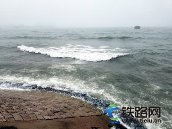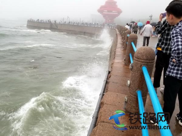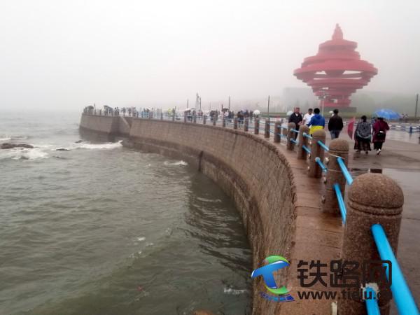 下午五時許,五四廣場游客絡(luò)繹不絕,冒著雨,撐著傘,獨自游,結(jié)伴游,團(tuán)體游,緊緊繞著黃海堤岸,觀賞大海的力量。