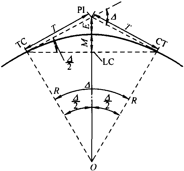 在單曲線的中心線位置或其立樁標(biāo)定線上,如果可能的話,切線 (朝其端部) 應(yīng)當(dāng)延 長到一個(gè)交叉點(diǎn)PI,并測(cè)量交叉角Δ(圖19-4)。從曲線起點(diǎn)TC到PI以及從曲線終點(diǎn) CT到PI的切線長度T,可以由式 (19.3) 確定