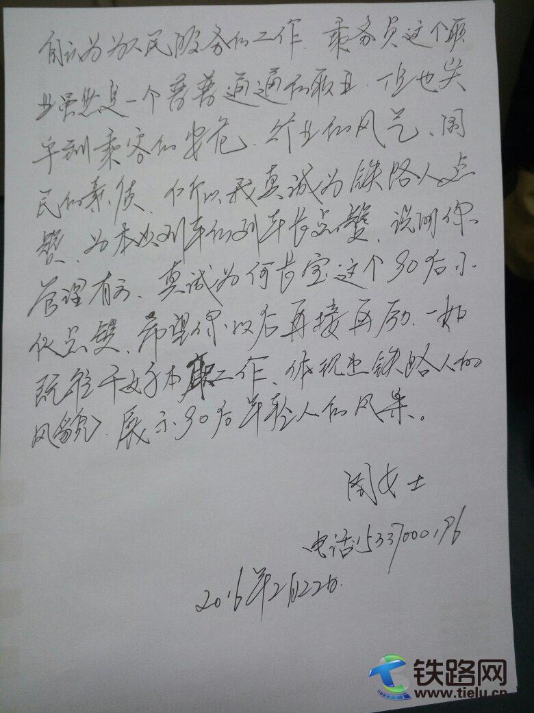 第一次參加春運(yùn),為了確保旅客安全愉快的旅行,他不僅落實(shí)作業(yè)標(biāo)準(zhǔn),還經(jīng)常在車(chē)廂里進(jìn)行安全宣傳。他的一舉一動(dòng)得到了旅客的認(rèn)可,2月21號(hào)他值乘的北京至烏魯木齊南Z179次8號(hào)車(chē)廂的旅客周女士為他寫(xiě)下了熱情洋溢的表?yè)P(yáng)信,鼓勵(lì)他繼續(xù)努力,為鐵路戰(zhàn)線(xiàn)上的90后小伙伴們繼續(xù)爭(zhēng)光!
