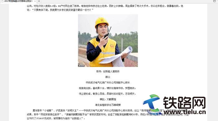 10月25日,經(jīng)湖北省各地各部門層層推薦,湖北省委宣傳部組織評(píng)審,“荊楚楷!2017年度10月上榜人物名單揭曉。其中,經(jīng)湖北省國資委推薦,中國中鐵武漢電氣化局集團(tuán)廣州分公司東海島項(xiàng)目部預(yù)配中心班長陳偉位于8人上榜人物之列。