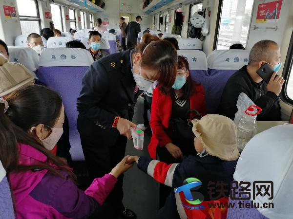 隨著疫情得到有效控制和緩解,復(fù)工復(fù)產(chǎn)的人員重返崗位,列車(chē)旅客不斷增加,庫(kù)爾勒客運(yùn)段杭州車(chē)隊(duì)干部職工繼續(xù)全力以赴,積極做好疫情防控工作。杭州四組的乘務(wù)員們嚴(yán)格按照車(chē)隊(duì)防護(hù)要求,戴口罩,勤洗手加強(qiáng)自我防護(hù)的同時(shí),對(duì)上車(chē)旅客做好體溫測(cè)量和登記,對(duì)列車(chē)各處所按照規(guī)定進(jìn)行全方位消毒。趙建坤作為班組的業(yè)務(wù)員,沒(méi)有因?yàn)槁每途阍,工作量增大而僅限于完成她的業(yè)務(wù)工作。她認(rèn)真落實(shí)班組的各項(xiàng)工作,列車(chē)運(yùn)行在大區(qū)段,她做好防護(hù)下車(chē)廂為旅客辦理補(bǔ)票。辦公車(chē)工作量大,她忙完手頭的活,主動(dòng)協(xié)助乘務(wù)員進(jìn)行車(chē)廂的消毒工作。